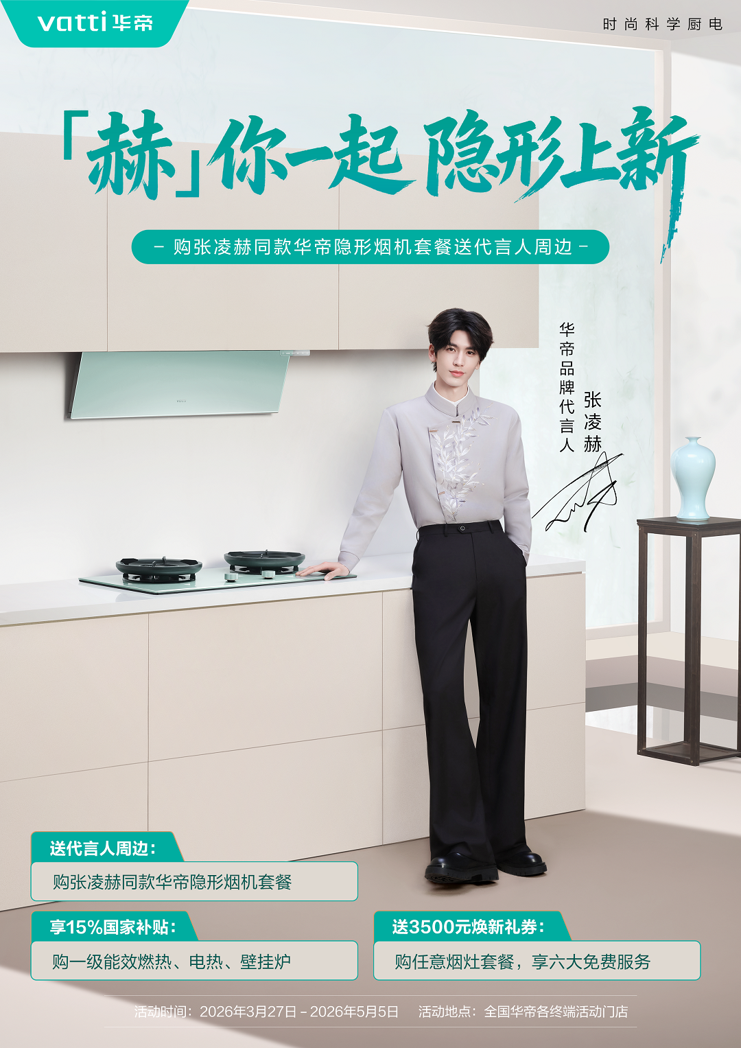 整套瓷话套系风格统一雅致,温润青瓷质感高级耐看,轻松打造高颜值治愈厨房。同时不用饱受油烟困扰、不为狭小空间憋屈、不用纠结难控火候,五一宅家慢悠悠下厨,安心享受烟火日常,松弛自在,氛围感拉满。恰逢五一假期,华帝重磅开启专属焕新福利,诚意降低年轻人厨电焕新决策门槛。即日起至5月5日,购买华帝一级能效燃热、电热、壁挂炉产品可享受15%国补优惠;另外活动期间购买华帝“瓷话套系”隐形烟机套餐可送代言人张凌赫周边,还有价值3500元的焕新礼券等,多重福利叠加,轻松升级理想舒适厨房!